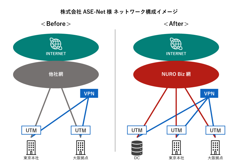 クラウドデータセンターについてさっそく機能や料金を比較し、キャリアフリーの純国産クラウドサービス(IaaS)を選定した同社。クラウド側の回線とUTMは“持ち込み型”とし、これまで東京本社と大阪拠点で実績をあげていた「NUROアクセス 2G」を採用した。