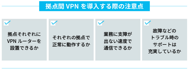 特に、VPNルーターの設置可能性、各拠点での動作の正常性、適切な通信速度の確保、そしてサポート体制の充実性が鍵となります。