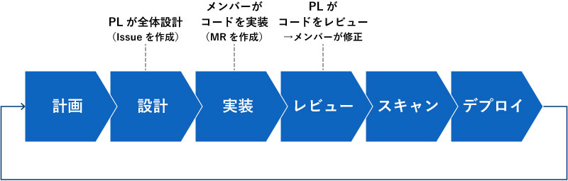 導入効果の前に、開発ライフサイクルにおける課題を見ておきましょう。一般的な流れとして、開発計画があり、それに基づいてプロジェクトリーダーが全体設計をおこないます。それをベースにメンバーがコードを実装し、プロジェクトリーダーがレビューし、必要に応じてメンバーが修正、脆弱性などのスキャンを経てデプロイ、となります。
