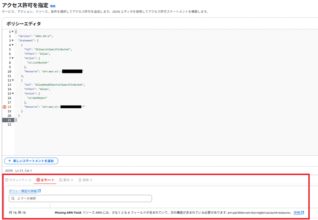 文法エラーとして「Missing ARN Field」と記載があり、ARNの形式が間違っていることが指摘されています。