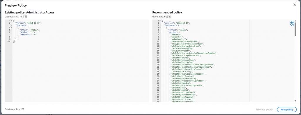 未使用のアクセスに対する検出結果では、AWSから修復手順として推奨ポリシーを生成してくれます。