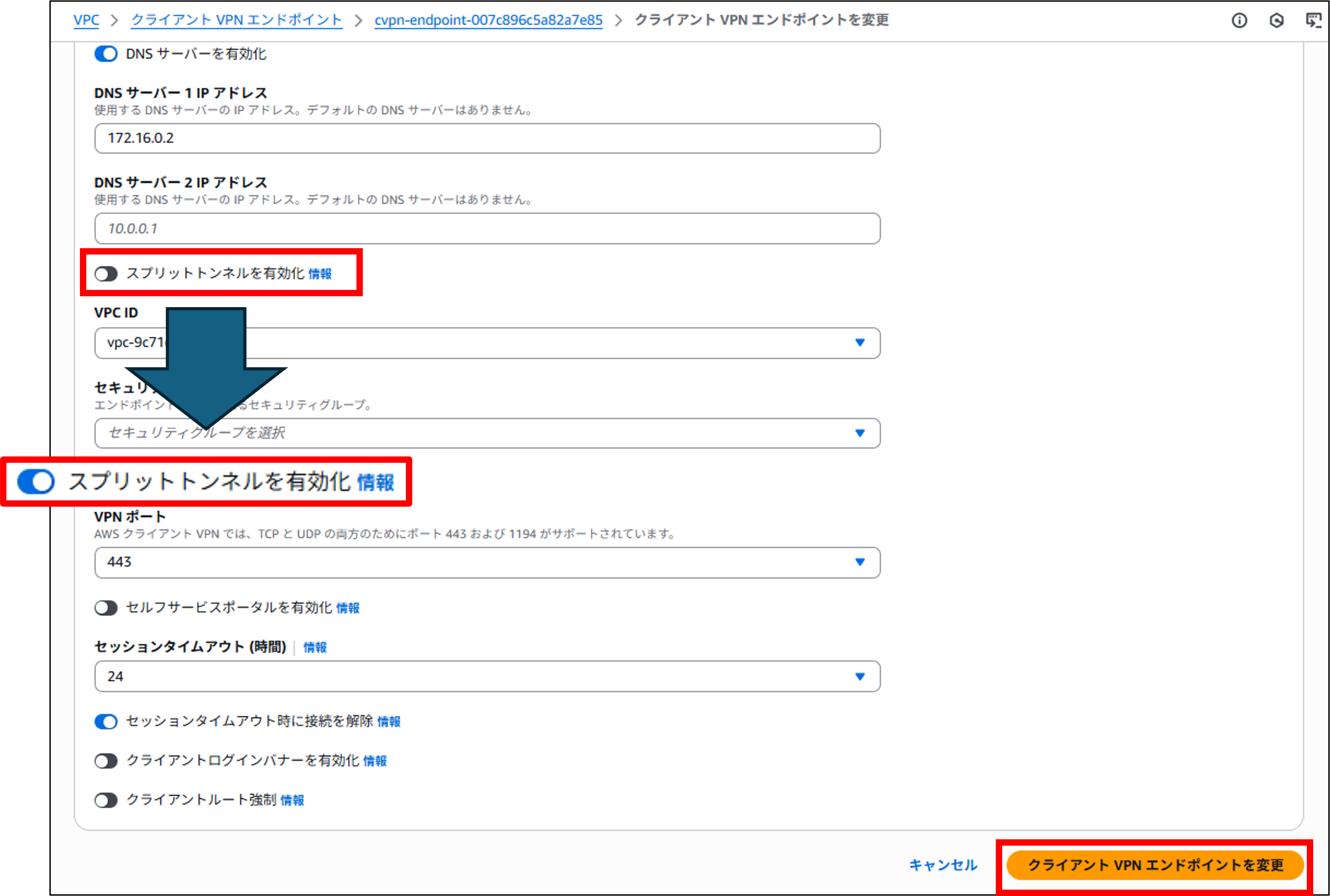 手順としてはルート強制と同様に[アクション]より[クライアントVPNエンドポイントを変更]から変更画面の[スプリットトンネルを有効化]を有効にして[クライアントVPNエンドポイントを変更]をクリックします。
