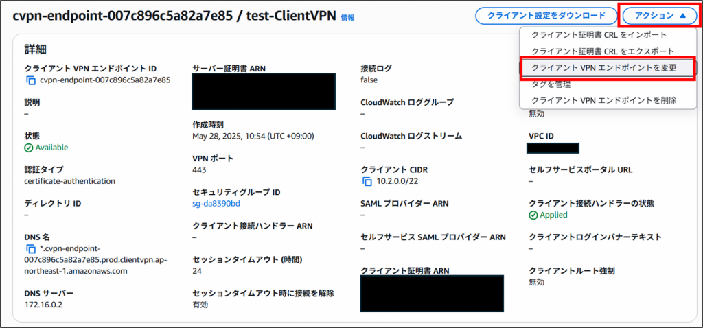 ①[アクション]より[クライアントVPNエンドポイントを変更]をクリックします。