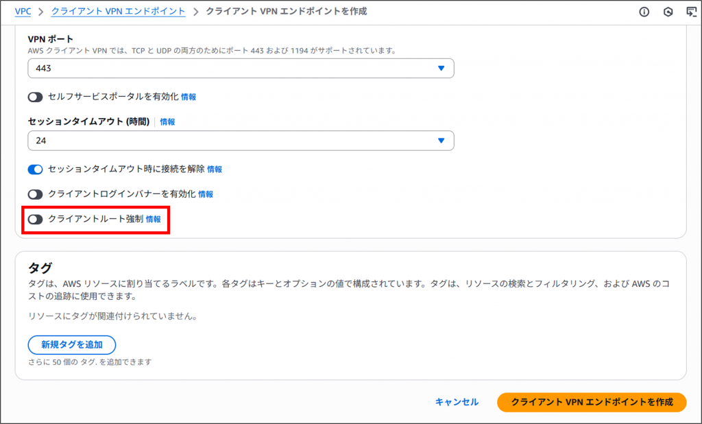 なお、クライアントVPNエンドポイント作成時にもクライアントルート強制の項目が追加されているため、有効にして作成することも可能です。