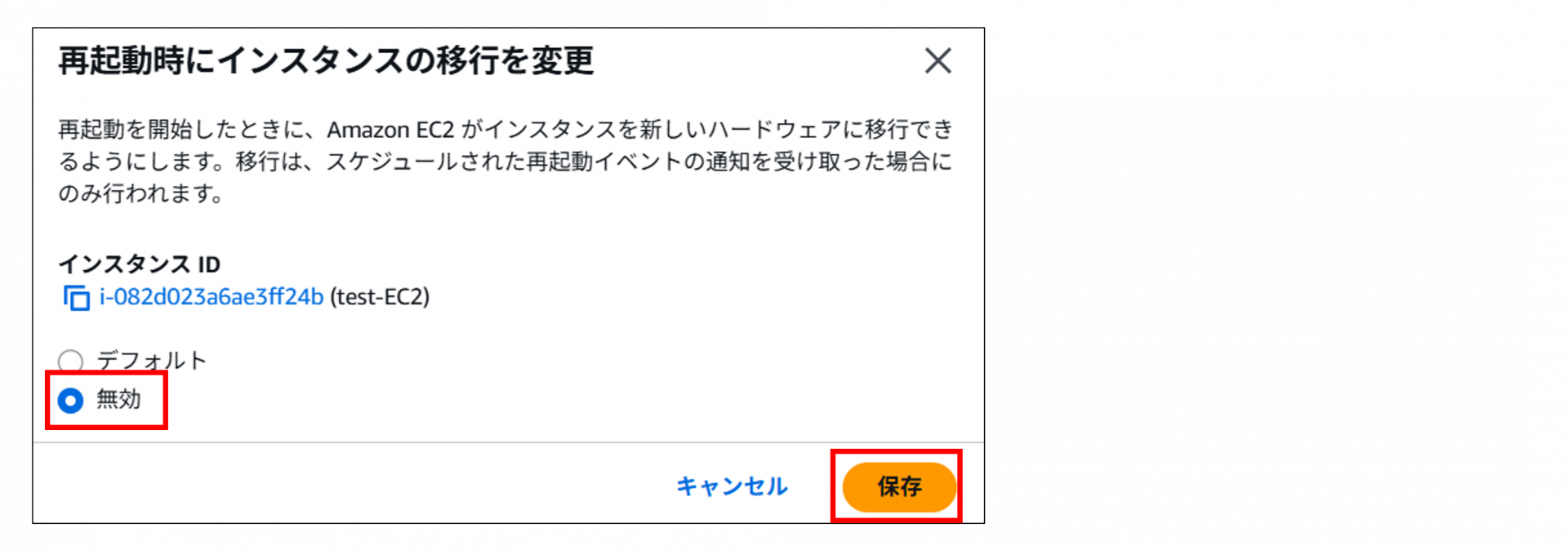 4.[インスタンスの再起動時の移行]が[オフ]に変われば無効化完了です。