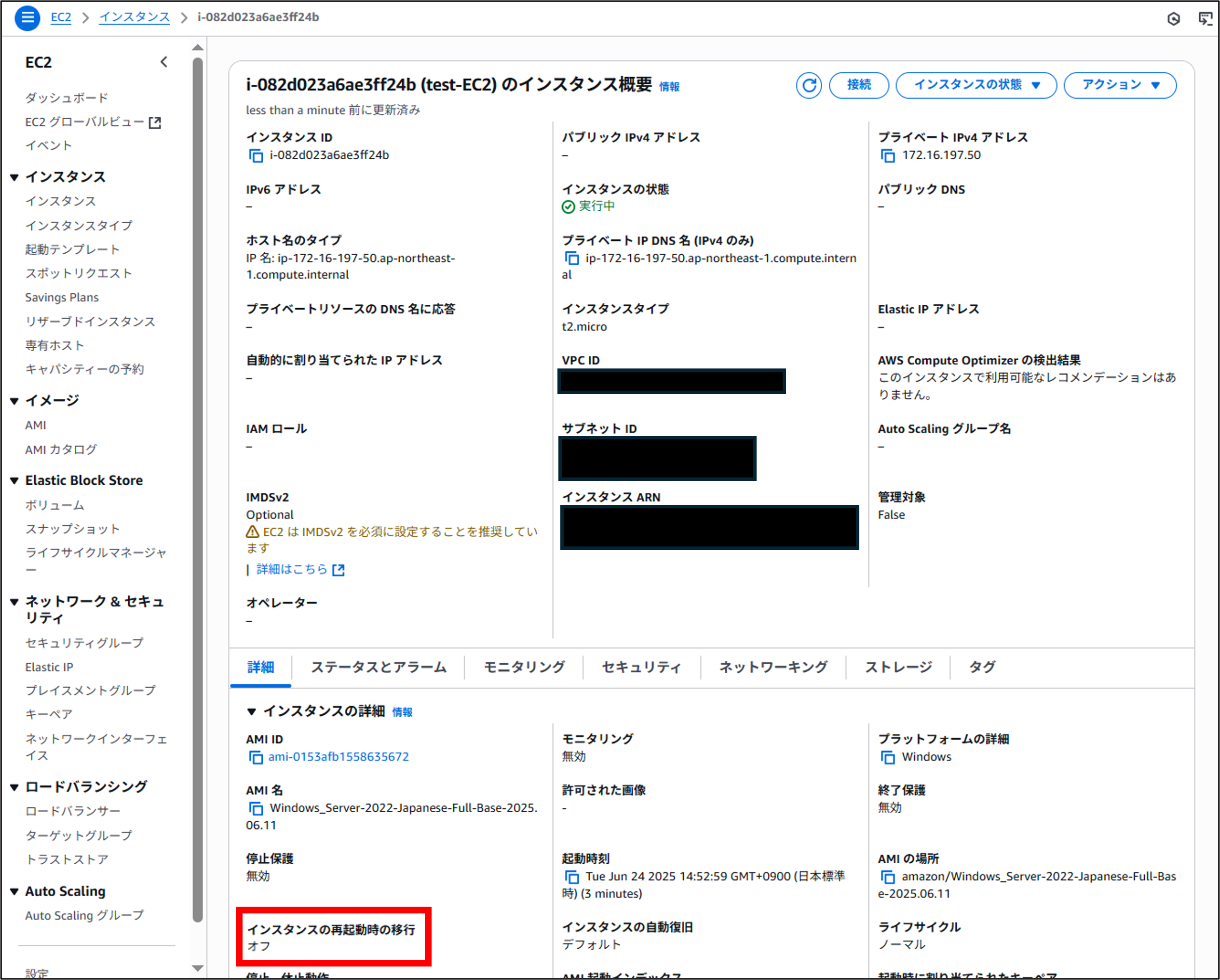 1.EC2インスタンスの概要の[インスタンスの再起動時の移行]が[デフォルト(オン)]になっていることを確認します。
