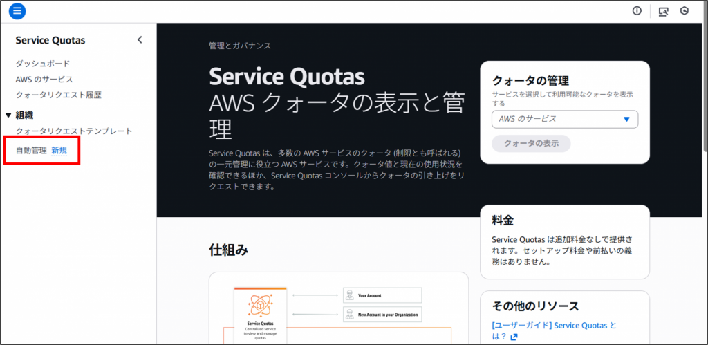 実際にService Quotas コンソールにサインインすると「自動管理」という項目が新規に追加されていました。