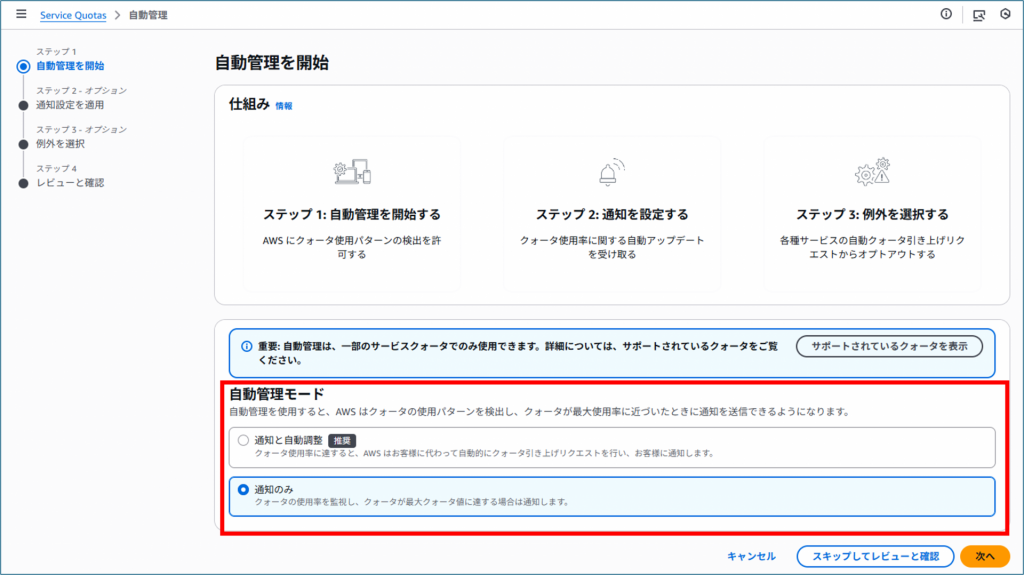 AWS Service Quotas に「自動クォータ管理」機能が一般提供され、クォータ使用量の監視と通知が可能になりました。