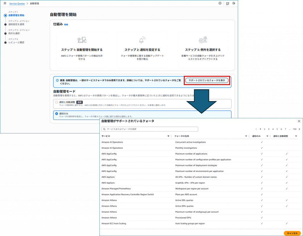 「サポートされているクォータを表示」をクリックすると「通知のみ」サポートされているクォータ一覧が確認でき、さらにその中で「通知と自動調整」のサポートの有無を確認することができます。