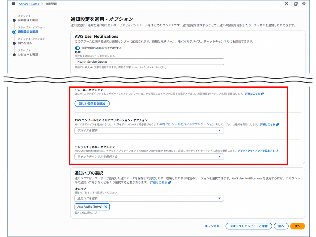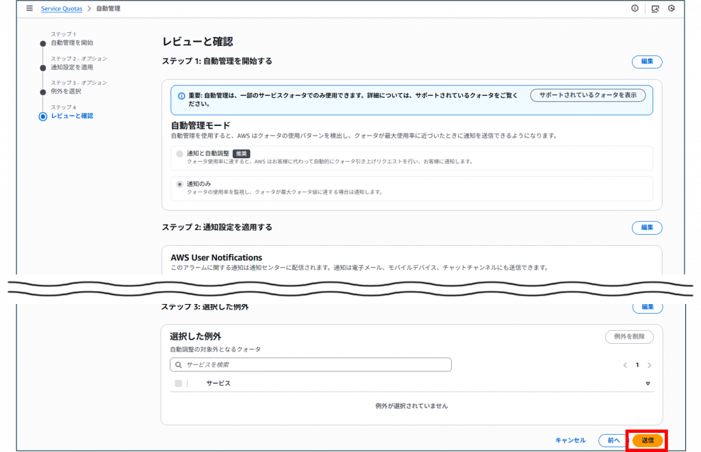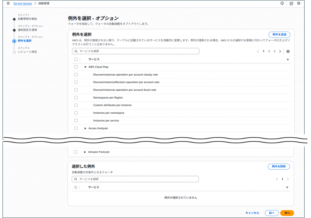 「例外を選択」の項目では通知や引き上げリクエストの適用から除外するクォータを設定することができます。