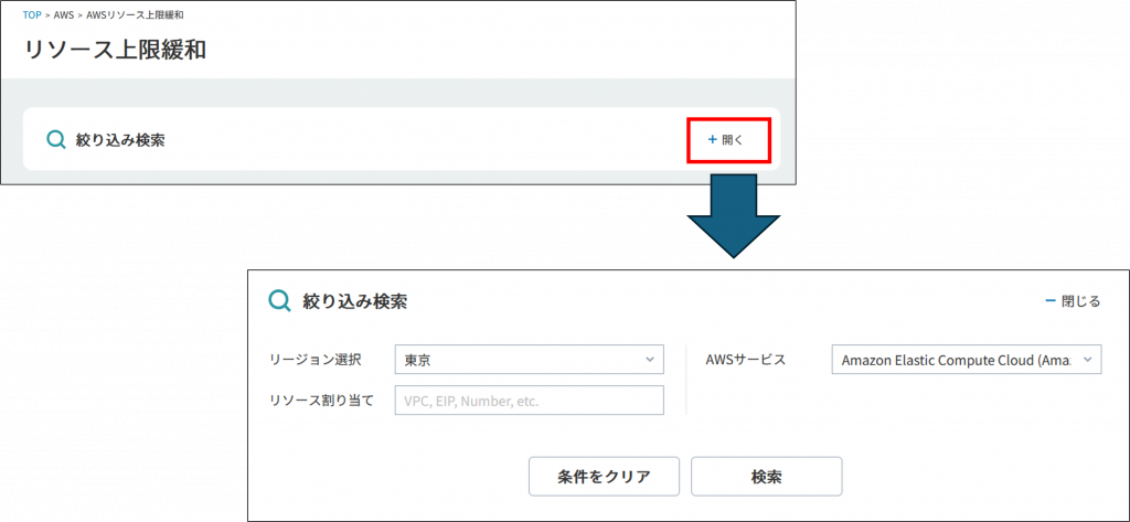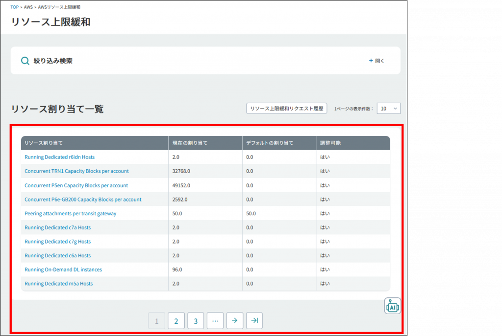 ※「絞り込み検索」から対象リージョンやAWSサービス、クォータ名を絞って検索することもできます。
