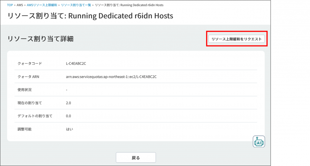 4.「リソース上限緩和をリクエスト」をクリックします。