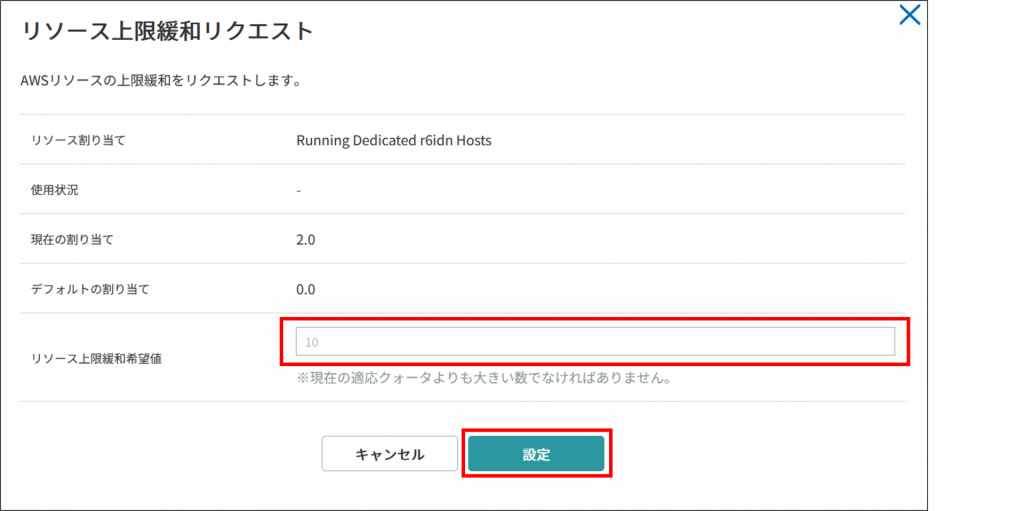 5.「リソース上限緩和希望値」を入力し、「設定」をクリックします。