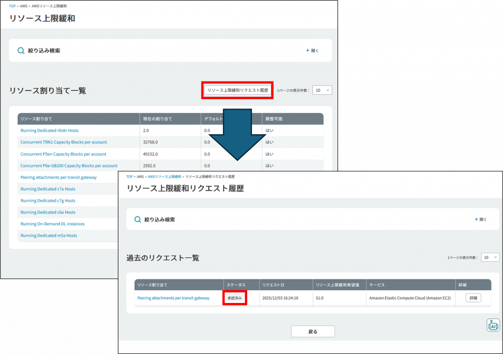 6.リクエストの結果は「リソース上限緩和リクエスト履歴」にて確認いただくことができます。ステータスが「承認済み」になれば上限緩和完了です。