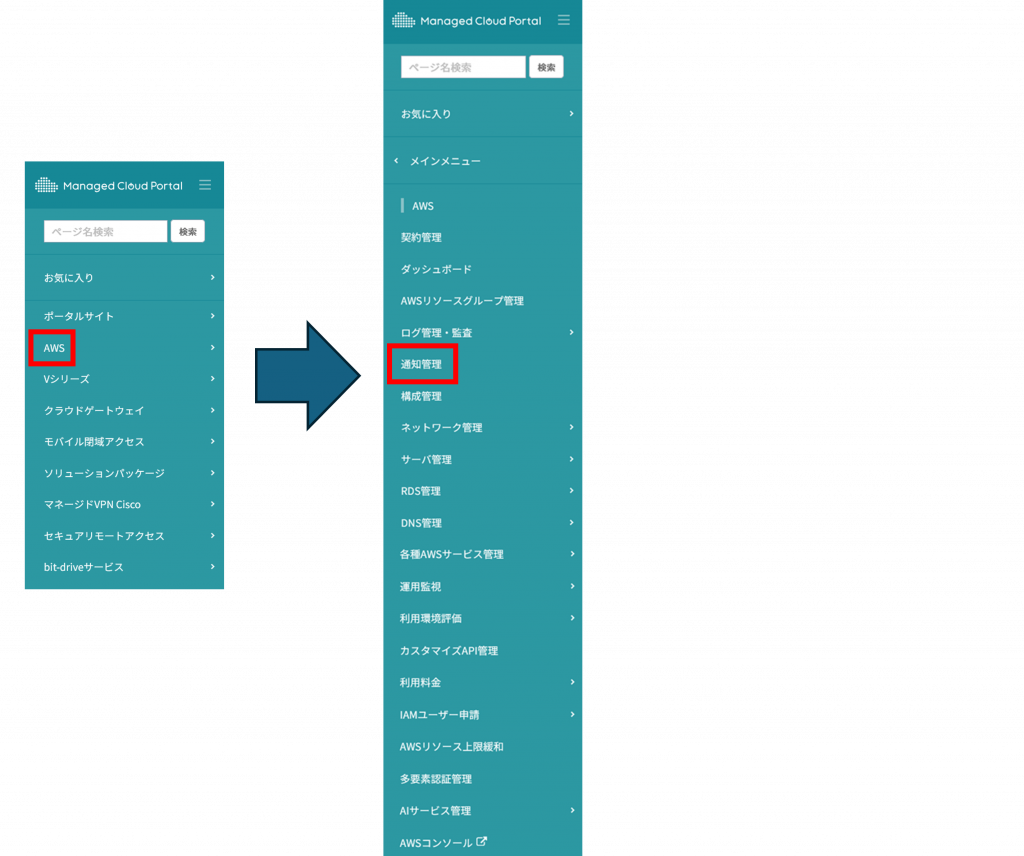 7.左メニューより[AWS] > [通知管理]をクリックします。