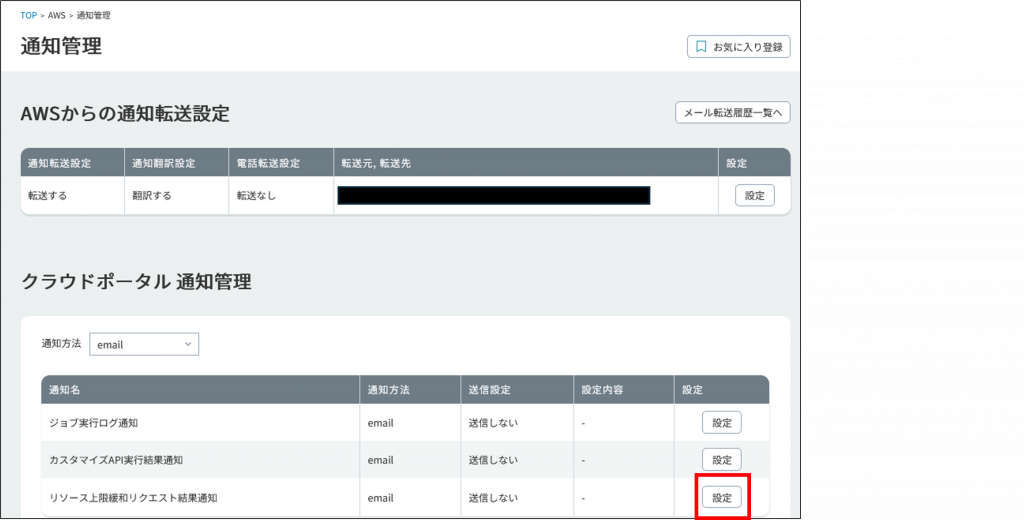 8.リソース上限緩和リクエスト結果通知の「設定」をクリックします。