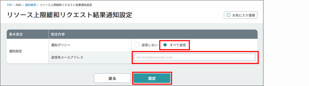 9.通知ポリシーを「すべて送信」、送信先メールアドレスにメールアドレスを入力し、「設定」をクリックします。ステータスが変化した場合に、指定されたメールアドレスに通知されます。