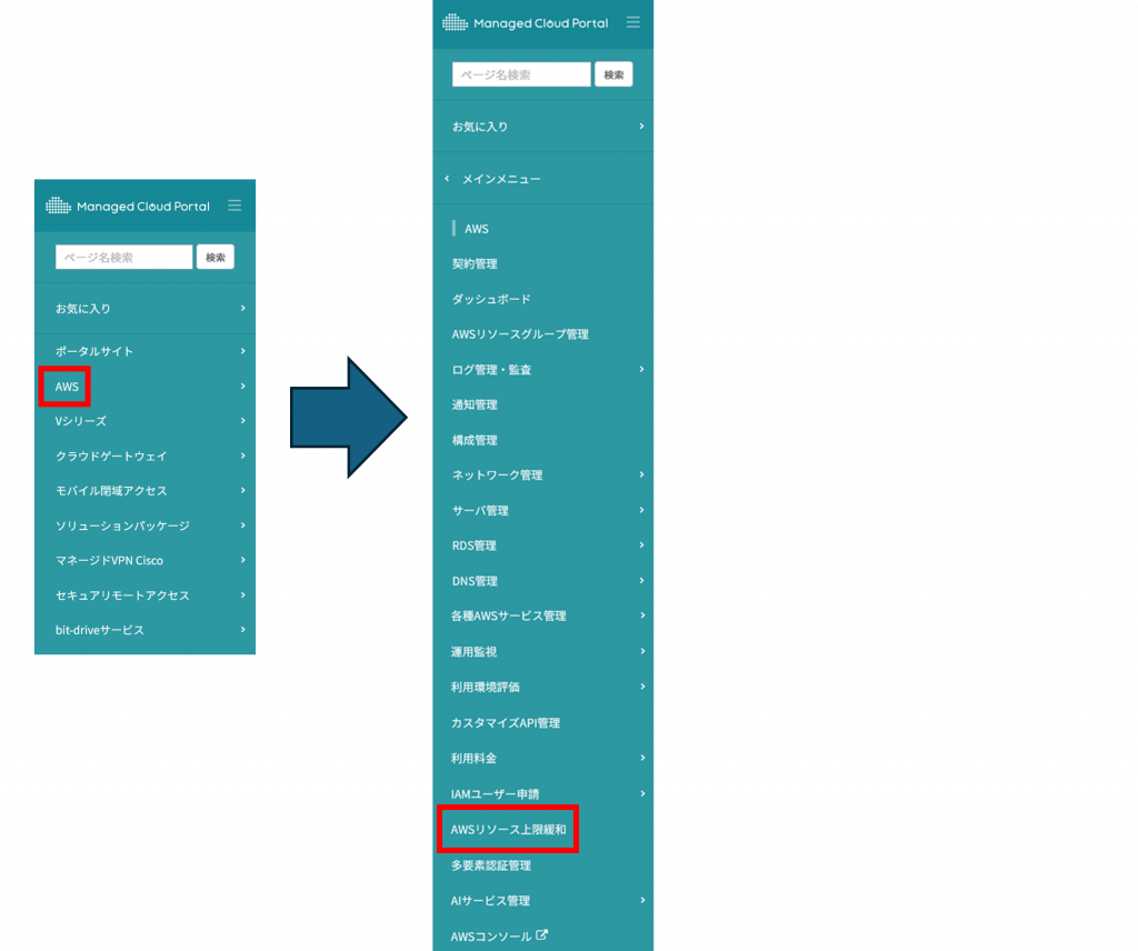 2.左メニューより[AWS] > [AWSリソース上限緩和]をクリックします。