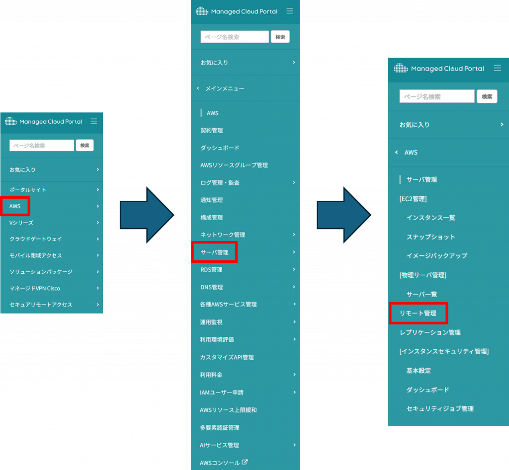 2.左メニューより[AWS] > [サーバ管理] > [リモート管理]をクリックします。