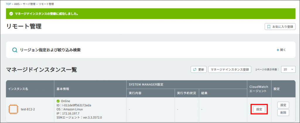 5.マネージドインスタンス一覧に登録されたことを確認し、CloudWatchエージェントの[設定]をクリックします。