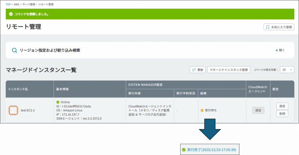 7.結果が実行待ちから実行完了に変わった(通常10分程度で変わります)らCloudWatchエージェントのインストールとメモリ使用率、ディスク使用率の取得が完了です。