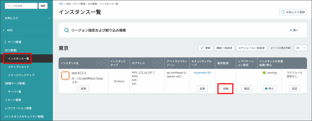 8.左メニューより[インスタンス一覧]をクリックし、対象インスタンスの運用監視の[詳細]をクリックします。