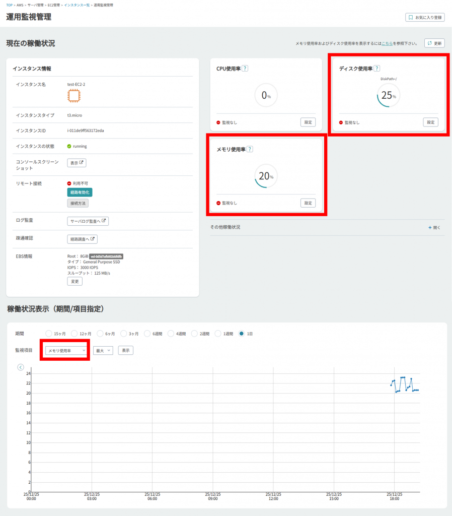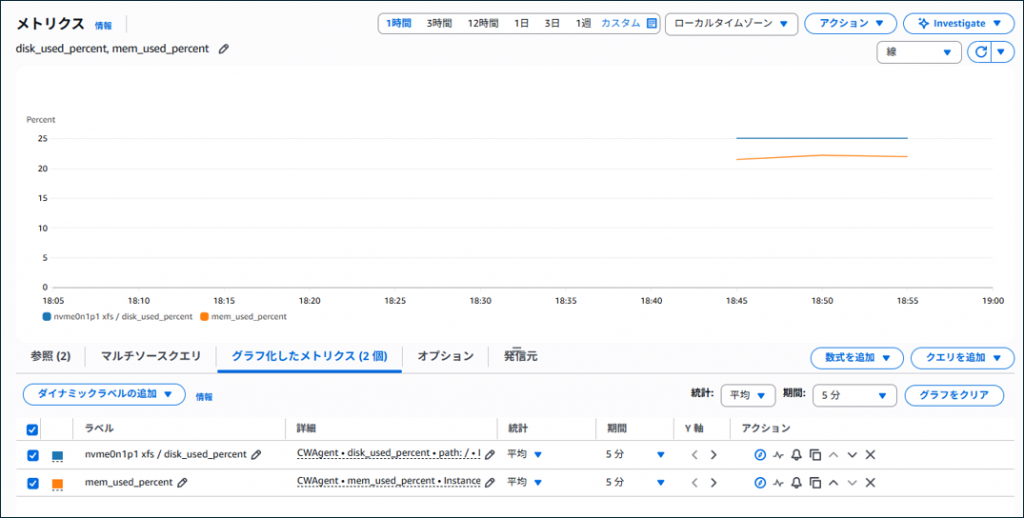14.メトリクスを確認するとメモリ使用率とディスク使用率が取得できていることを確認しました。