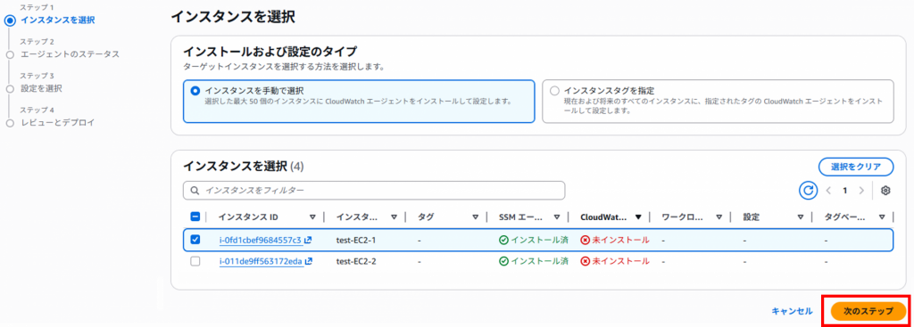 6.対象のEC2インスタンスにチェックを入れ、[次のステップ]をクリックします。