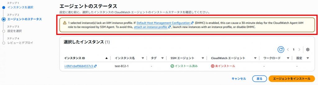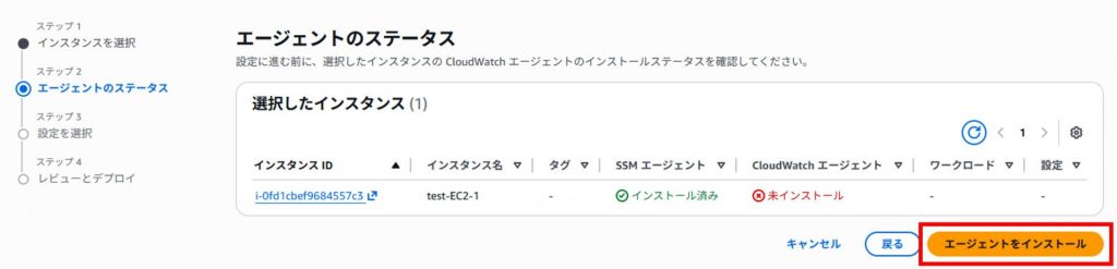8.IAMロールをEC2インスタンスにアタッチしたため、改めてエージェントをインストールする画面から[エージェントをインストール]をクリックします。