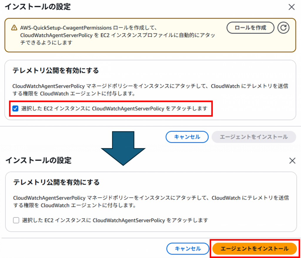 9.[選択したEC2インスタンスにCloudWatchAgentServerPolicyをアタッチします]のチェックを外し、[エージェントをインストール]をクリックします。
