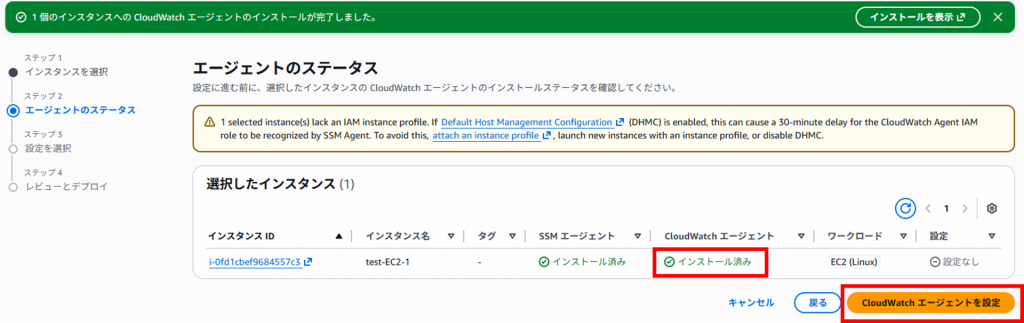 10.CloudWatchエージェントがインストール済みになったことを確認し、[CloudWatchエージェントの設定]をクリックします。