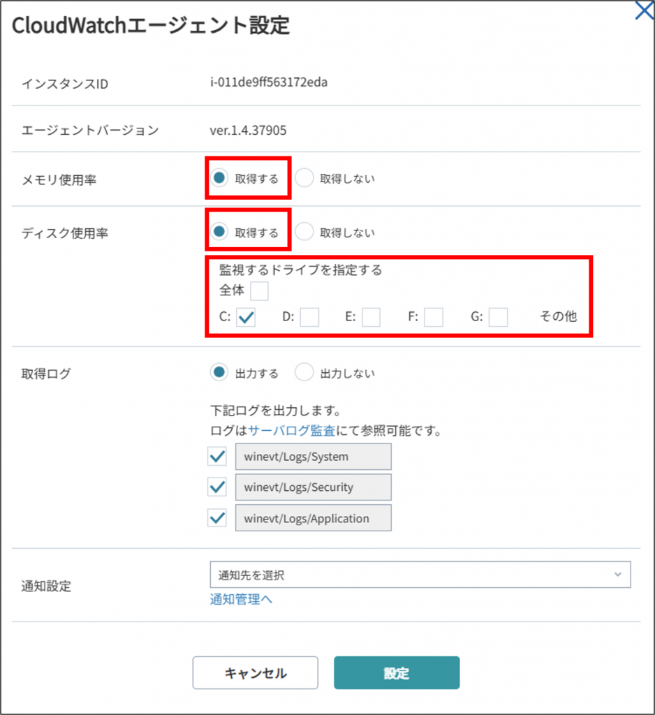 ※ディスク監視について、デフォルトではすべてのドライブが監視対象となりますが、特定のドライブのみ監視したい場合は、[EC2]内の[設定の編集]からドライブを指定することが可能です。