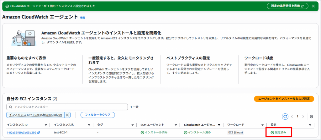 13.設定が[設定済み]になればCloudWatchエージェントのメモリ使用率とディスク使用率取得の設定が完了です。