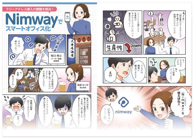 フリーアドレス導入が決まった会社の総務部メンバー 有川が、大学の先輩 高城のアドバイスでフリーアドレスの課題を解決するまでをコミックで紹介。