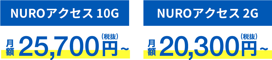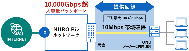 - ※「10Gbps」「2Gbps」という通信速度はNURO Bizネットワークからお客様ご利用場所に設置する回線終端装置へ提供する技術規格上の最大速度です。お客様が使用する個々の端末機器までの通信速度を示すものではありません。インターネットご利用時の実効速度は、お客様のご利用環境(端末機器の仕様等)や回線の混雑状況などにより、低下する場合があります。
