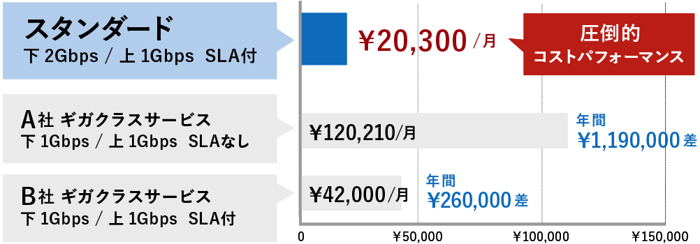 最低帯域10Mbps以上を確保したうえで、他社にはない驚きのローコストにてご提供しています。