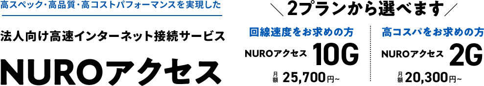 - ※「10Gbps」「2Gbps」という通信速度はNURO Bizネットワークからお客様ご利用場所に設置する回線終端装置へ提供する技術規格上の最大速度です。お客様が使用する個々の端末機器までの通信速度を示すものではありません。インターネットご利用時の実効速度は、お客様のご利用環境(端末機器の仕様等)や回線の混雑状況などにより、低下する場合があります。
