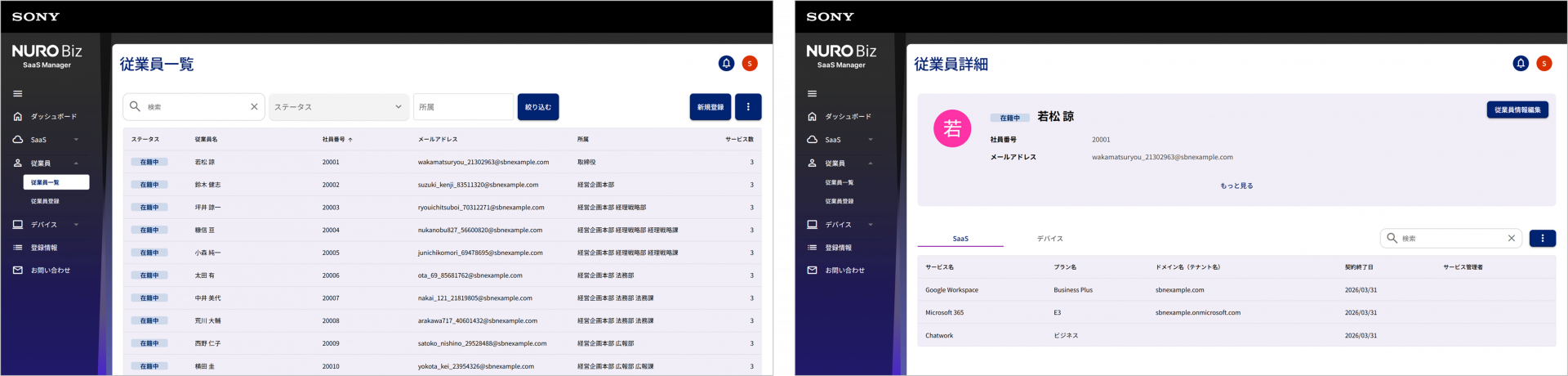 従業員の氏名、社員番号、メールアドレス、所属、使用しているSaaSやデバイスの情報を管理する機能。退職・休職した従業員が使用していたSaaSやデバイスを確認できるため、ライセンス停止やデバイス回収の対応漏れを防ぐことができます。