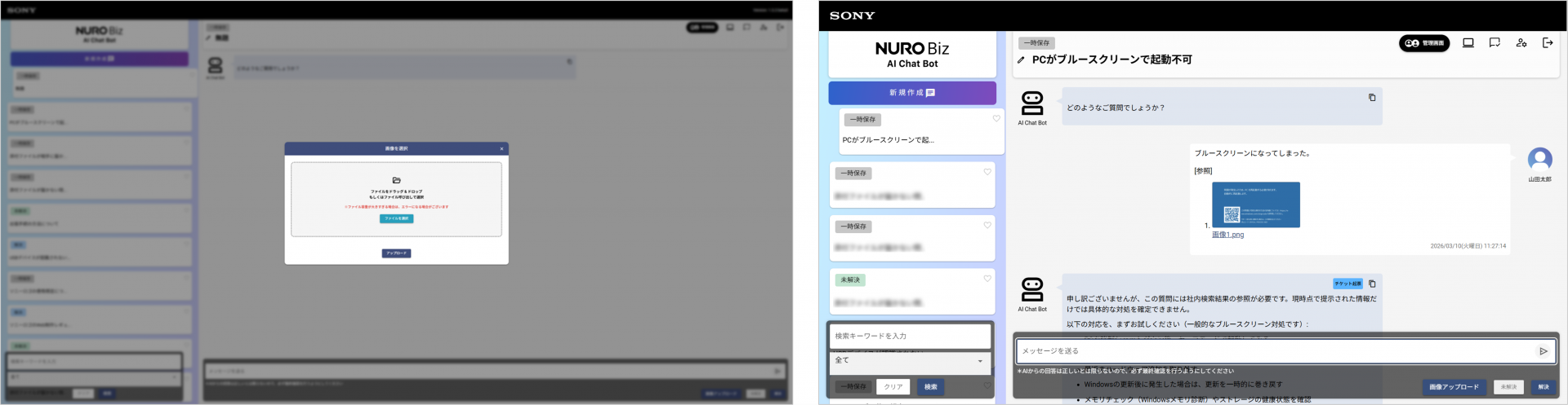 左:画像データはチャット画面にドラックアンドドロップまたはファイルの選択、スクリーンショットの貼り付けでアップロードが可能