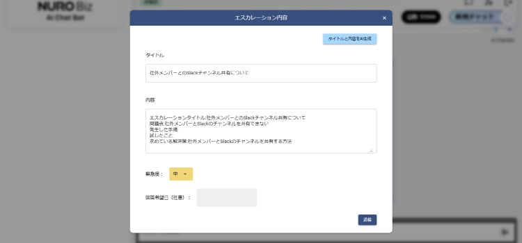 - チャットボットで解決しなかった場合、管理者への問い合わせチケットが作成可能。チケット作成時はAIがテキストを生成します。