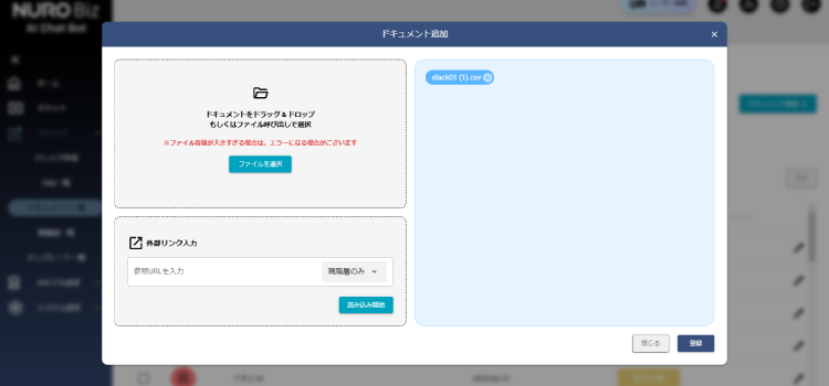 - 社内マニュアルやドキュメント(PDF/Word等)をアップロードするとAIが自動で学習。