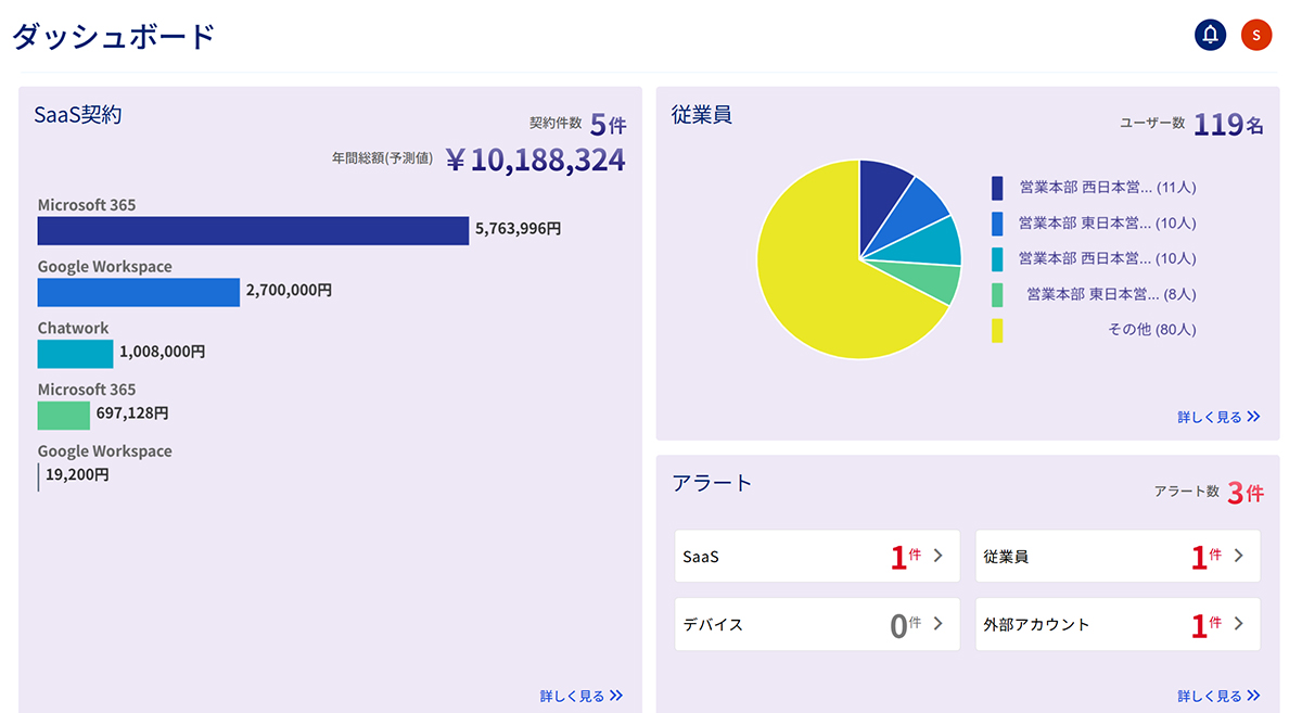 「契約中SaaSのサービス数/年間利用料金総額」「年間利用料金上位サービスのランキング」「所属別従業員数」「アラート件数」などを1画面で確認できます。