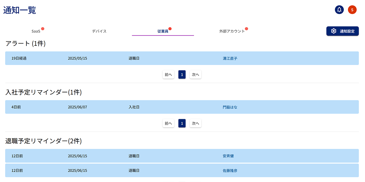 契約の更新期限や退職済みのユーザーが残っている場合、アラートを通知。