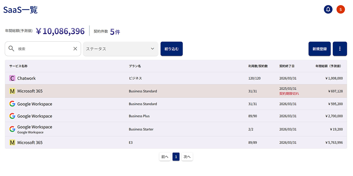 契約中SaaSの契約期間や利用ユーザーを一覧で可視化。