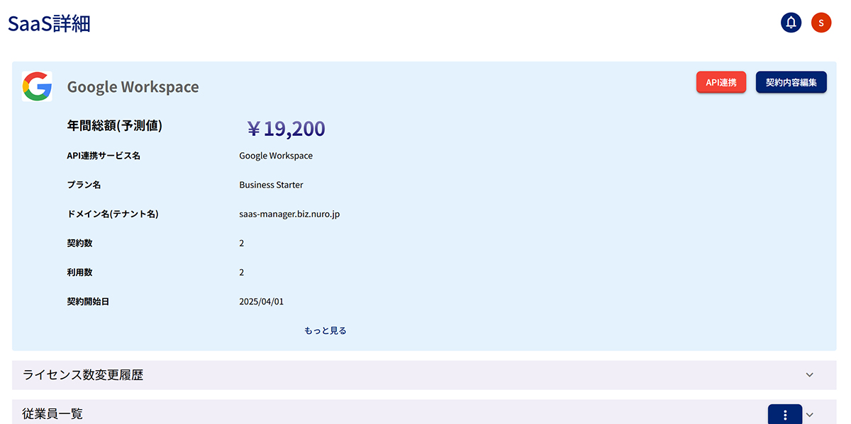 SaaSとAPI連携を行うことで、ライセンスを付与している従業員情報やプラン、ステータス状況を表示。