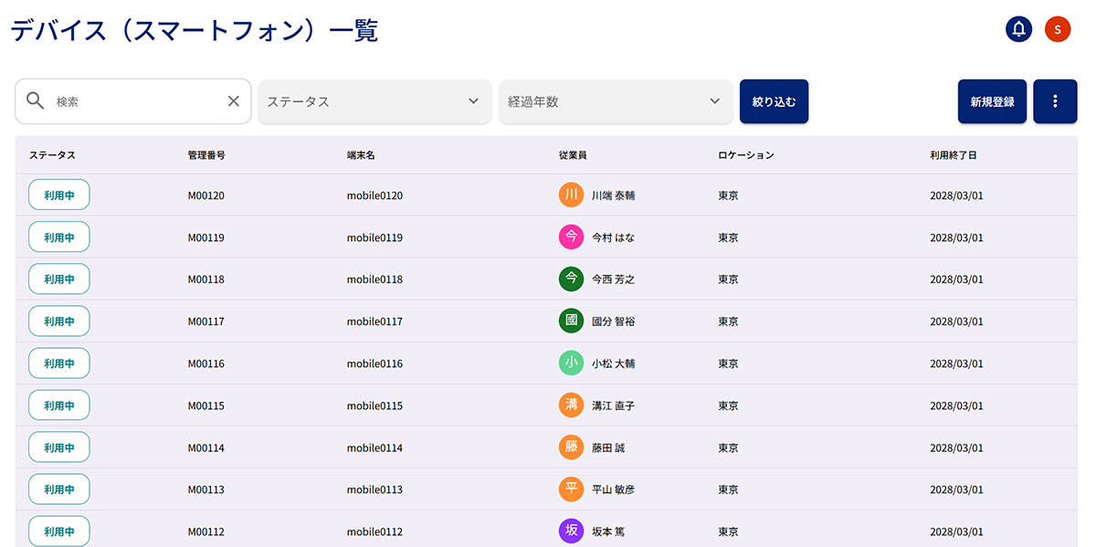 デバイス名で検索や、ステータスでフィルタリングが可能。