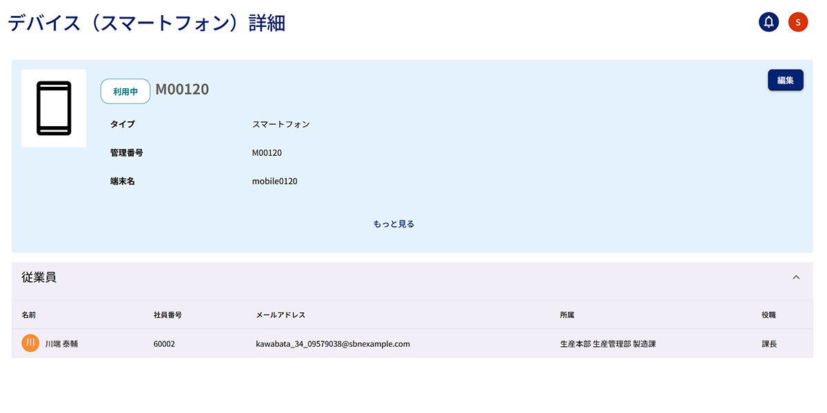 部署や属性、ステータスなどの詳細情報が入力でき、従業員ごとに利用しているSaaSやデバイスも確認可能。
