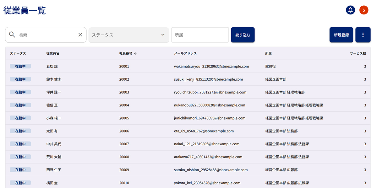 名前で検索や、退職者のみの表示などステータスによるフィルタリングが可能。