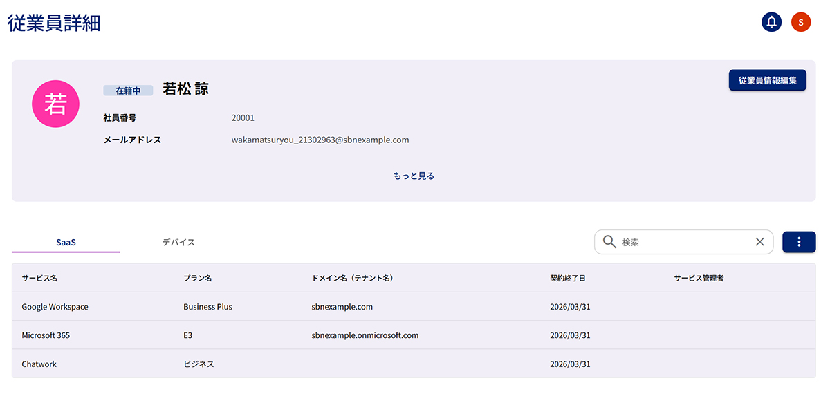 従業員情報の詳細と、従業員ごとに利用しているSaaS/デバイスを管理。