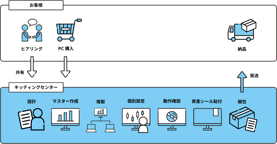 キッティングサービスとは、お客様在庫PCもしくは新規購入いただいたPCをお預かりしOS・アプリのインストール、ハード構成変更などの設定を代行するサービスです。